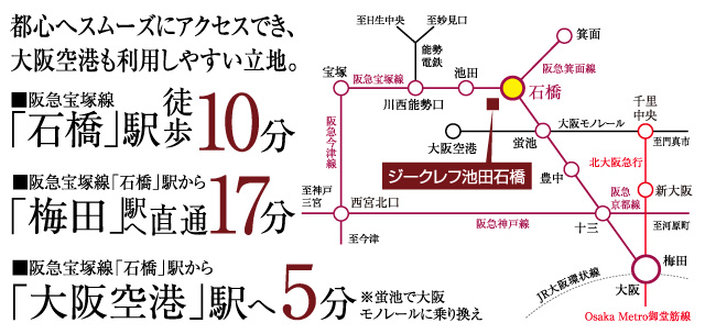マンションギャラリーは石橋駅から「いしばし商店街」「箕面川」を通り徒歩4分。街の散策を兼ねてご家族揃って訪ねてみませんか?