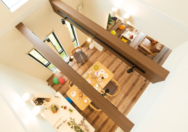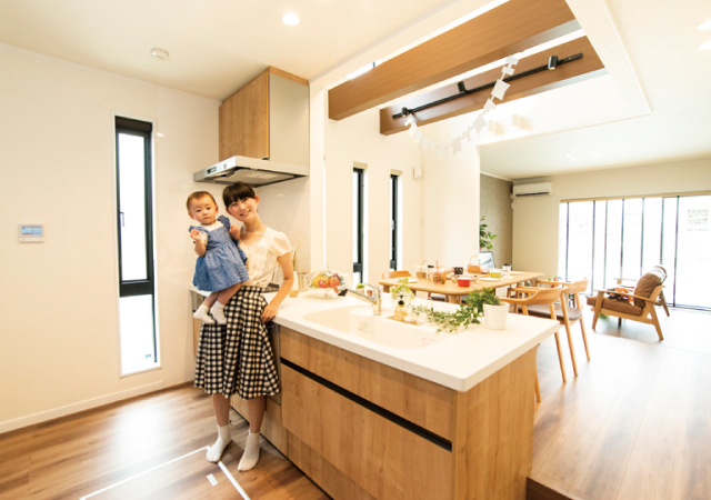 「シンクが広くて良いですね」とキッチンも気に入った様子の真由子ママ。ダイニングの上には4.5畳の吹き抜けがあり開放感いっぱい。とにかく広いので、ママ友の集まりやお子様同士のパーティーもできそうな空間でみんなと楽しい時間を過ごせそうですね。