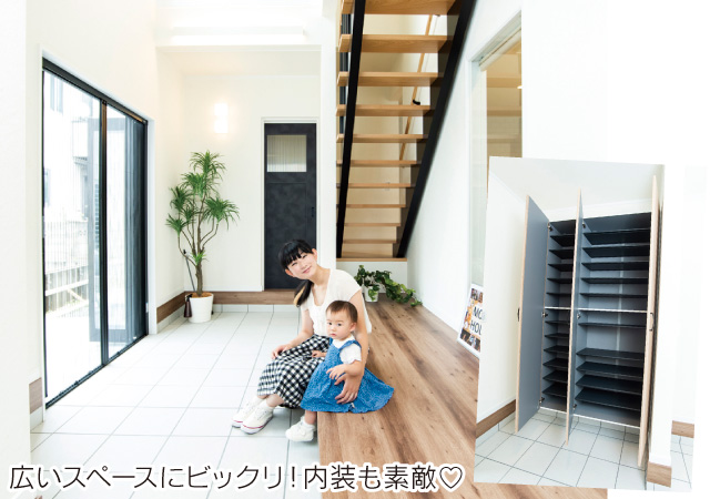 玄関ドアを開けると思わず「わぁ~」と歓声をあげる真由子ママ。その先には、大きな窓から光が差し込み、玄関の広さと吹き抜けが、空間をより広く感じさせます。