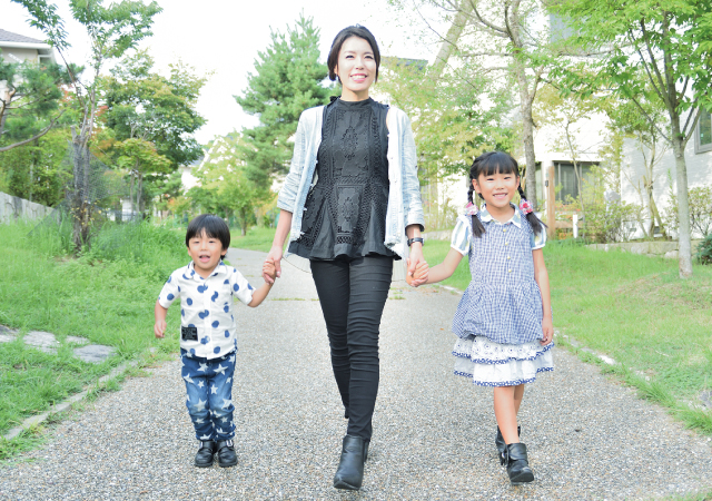 住宅街の通学路には、防犯カメラも設置。爽やかな風が吹き渡る緑道を通って帰って来る子どもたちは、元気に「こんにちは!」と挨拶してくれましたよ。子育て支援日本一を目指す箕面市のサポートも頼もしい味方です。